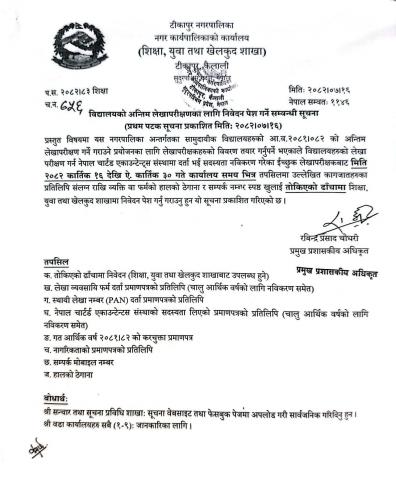टीकापुर वाटिकाको पूर्वतर्फ रहेको भवनको कोठाहरू (सटर कवल) को बहाल ठेक्का सम्बन्धी सूचना।