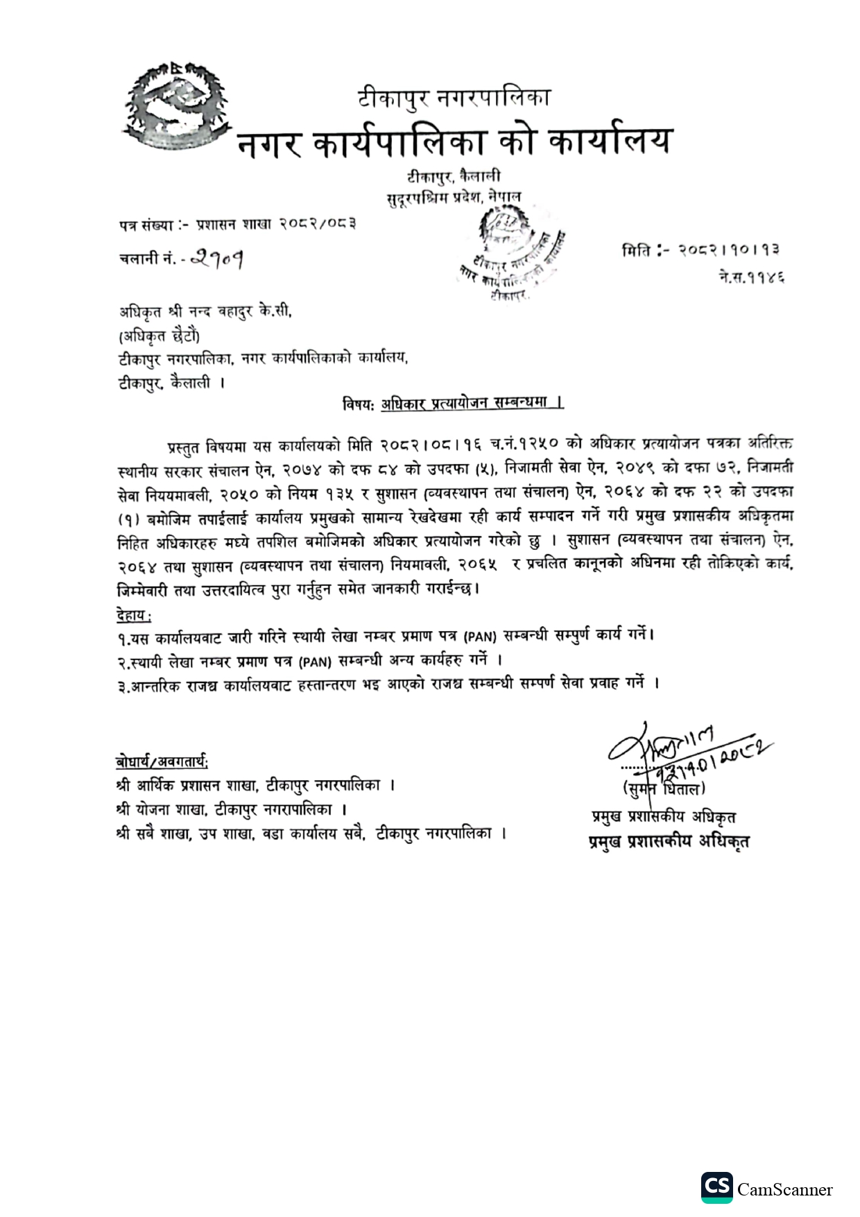 अधिकार प्रत्यायोजन जनकारी सम्बन्धमा।