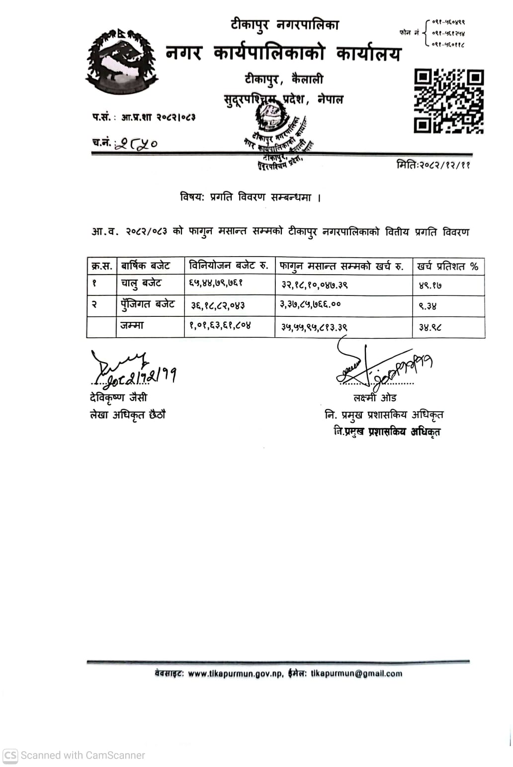 टीकापुर नगरपालिकाको आ.व. २०८२/०८३ फागुन महिना सम्मको प्रगति विवरण ।