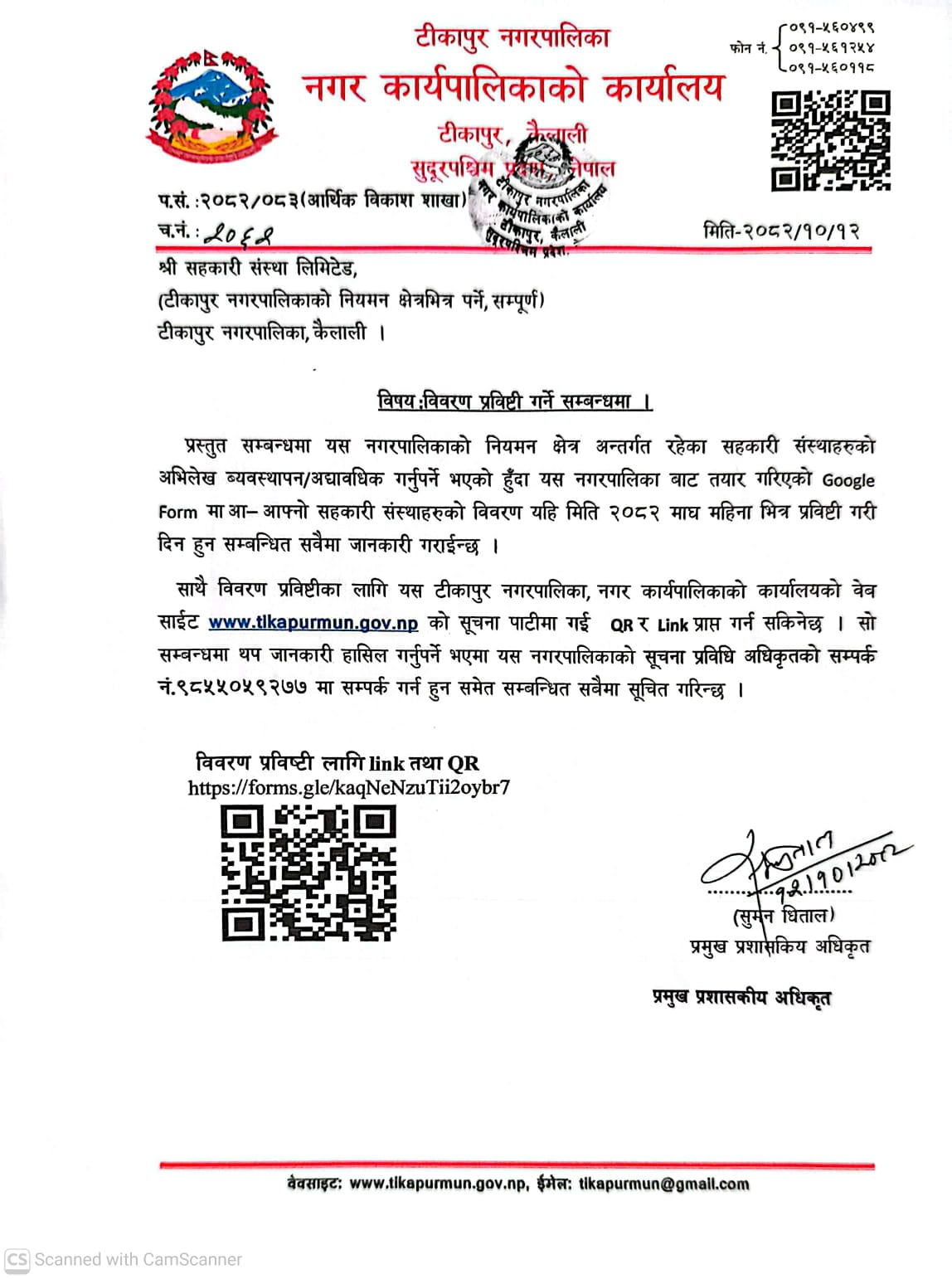 » टीकापुर नगरपालिकाद्वारा सहकारी संस्थाको विवरण संकलन सम्बन्धी सूचना।