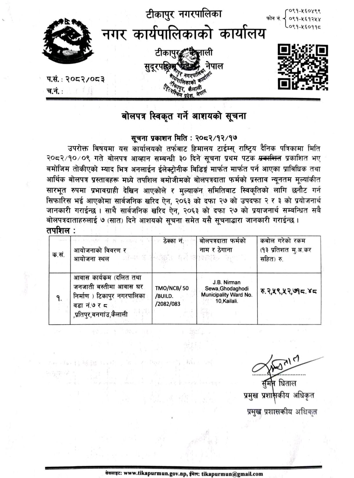 बोलपत्र स्वीकृत गर्ने आशयको सूचना।(२०८२/१२/१७)