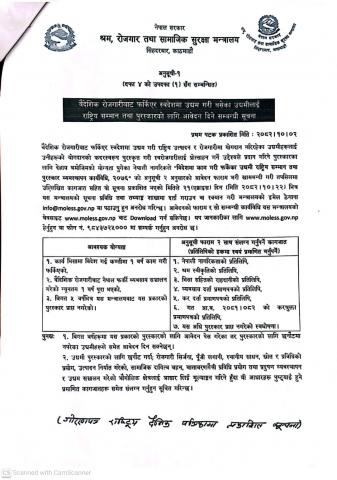 वैदेशिक रोजगारीबाट फर्किएर स्वदेशमा उद्यम गरी बसेका उद्यमीलाई राष्ट्रिय सम्मान तथा पुरस्कारलाई आवेदन दिने सम्बन्धी सूचना।